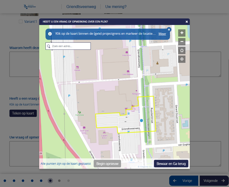 In Hoogeveen staat verkeersveiligheid hoog op de agenda. De gemeente wilde samen met inwoners kijken hoe de Griendtsveenweg veiliger en toegankelijker kon worden, met name voor voetgangers, fietsers en mindervaliden die dagelijks oversteken richting de winkels. Via PraatMee konden inwoners op de kaart reageren en hun mening geven over drie mogelijke oplossingen. Het resultaat: 154 reacties van betrokken bewoners uit de directe omgeving.