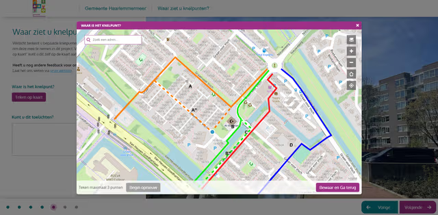 Een interactieve kaart stelt bewoners in staat om terugkerende verkeersproblemen te markeren of gebieden voor nieuwe parken voor te stellen. Op die manier wordt het delen van inzichten laagdrempelig, terwijl planners tegelijkertijd waardevolle informatie kunnen verzamelen en analyseren.
