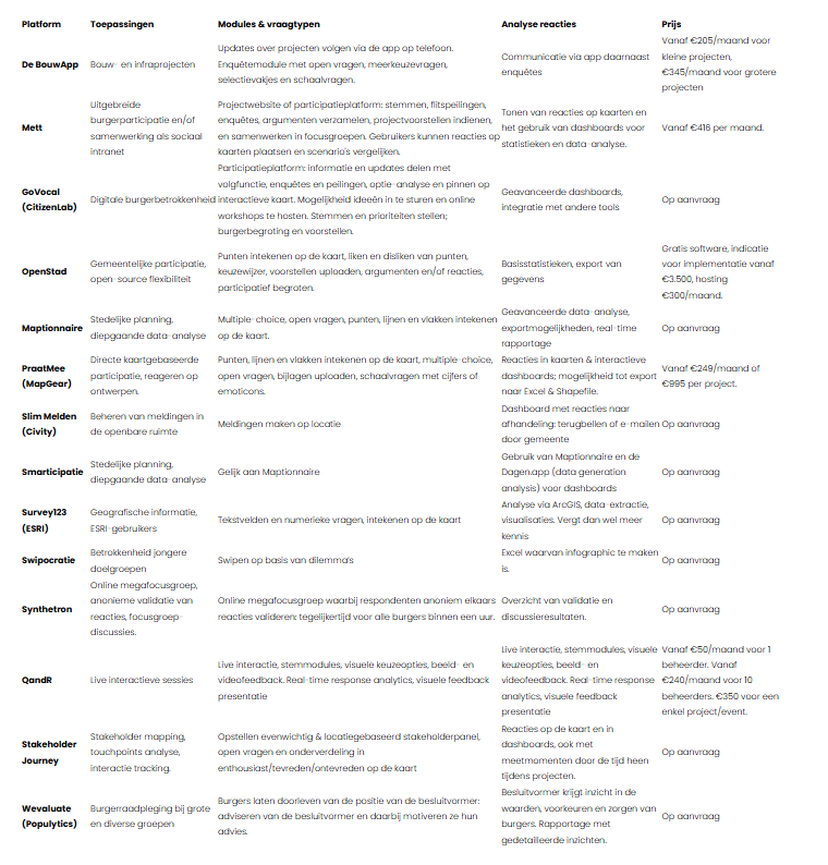 Hoewel het geografische component niet ontbreekt bij De BouwApp, Mett en Slim Melden (en dit voor veel organisaties ook voldoende kan zijn), gaan kaartgebaseerde tools zoals Maptionnaire, Smarticipatie, Survey123, PraatMee, Stakeholder Journey, en OpenStad hierin nog net een stapje verder. Deze platforms zijn doorgaans geschikter wanneer de kaart centraal staat in de participatie Deze platforms maken het mogelijk om feedback te koppelen aan specifieke locaties op een kaart, wat cruciaal is voor ruimtelijke ordening en stedelijke planning.